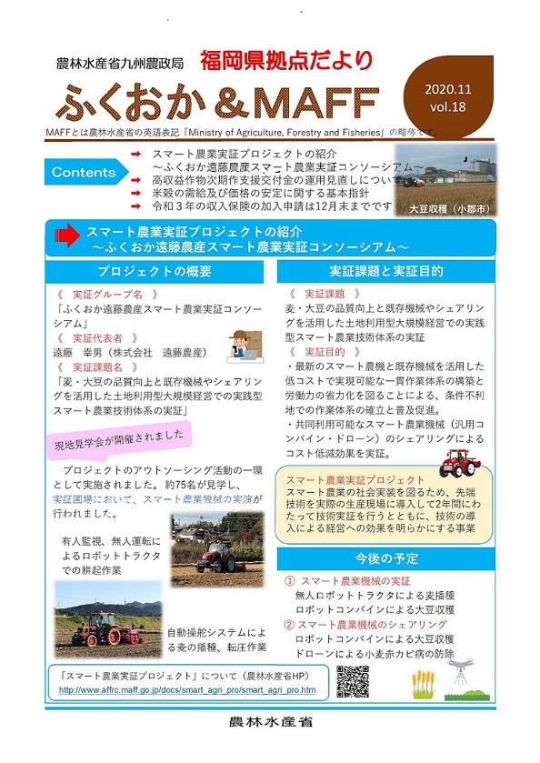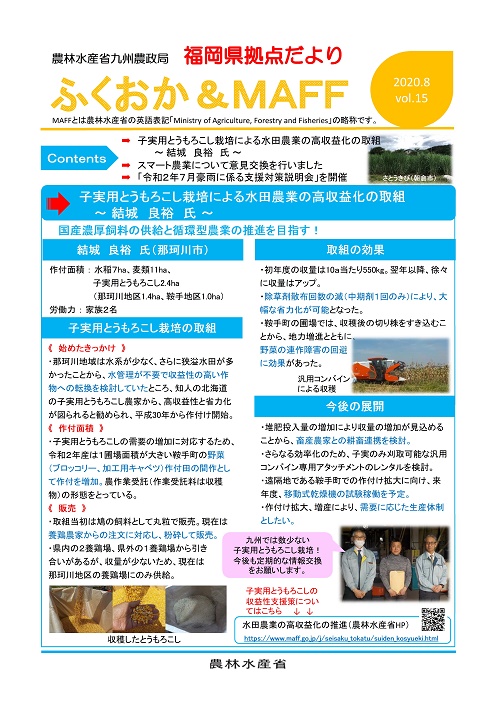 福岡県拠点だよりVOL.15(PDF : 324KB) | →子実用とうもろこし栽培による水田農業の高収益化の取組 ~結城 良裕 氏~ →スマート農業について意見交換を行いました →「令和2年7月豪雨に係る支援対策説明会」を開催 |
