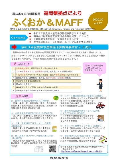 福岡県拠点だよりVOL.17(PDF : 579KB) | →令和3年度農林水産関係予算概算要求は2.8兆円 →高収益作物次期作支援交付金の運用見直しについて →豆類経営改善共励会受賞者を紹介します →渡り鳥の飛来シーズン間近、鳥インフルエンザに注意を |