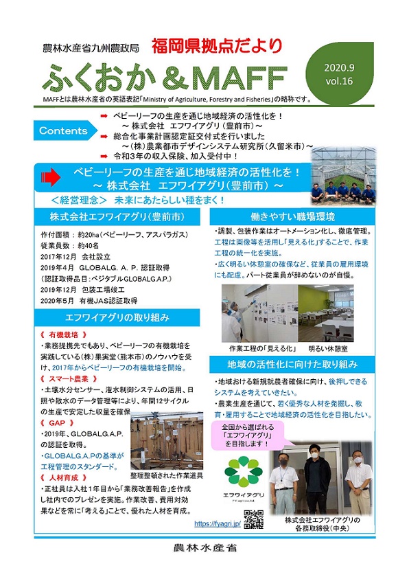 福岡県拠点だよりVOL.16(PDF : 347KB) | →ベビーリーフの生産を通じ地域経済の活性化を! ~株式会社 エフワイアグリ(豊前市)~ →総合化事業計画認定証交付式を行いました ~(株)農業都市デザインシステム研究所(久留米市)~ →令和3年の収入保険、加入受付中! |