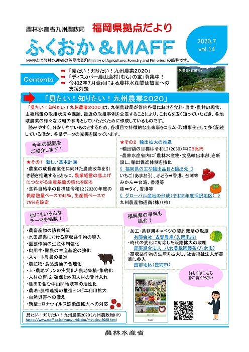 福岡県拠点だよりVOL.14(PDF : 283KB) | →「見たい!知りたい!九州農業2020」 →「ディスカバー農山漁村(むら)の宝」募集中! →令和2年7月豪雨による農林水産関係被害への支援対策 |
