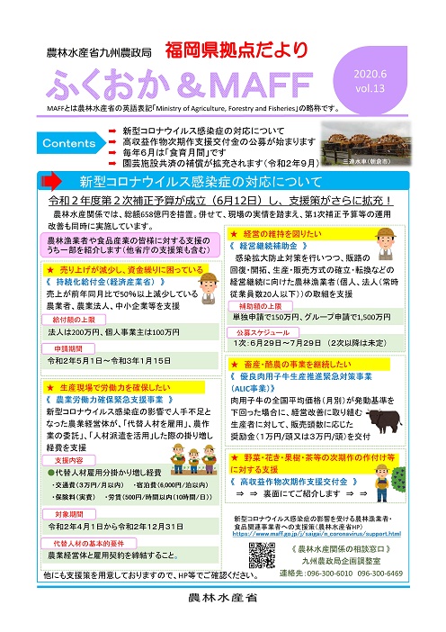 福岡県拠点だよりVOL.13(PDF : 334KB) | →新型コロナウイルス感染症の対応について →高収益作物次期作支援交付金の公募が始まります →毎年6月は「食育月間」です →園芸施設共済の補償が拡充されます(令和2年9月) |