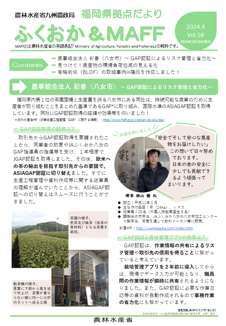 福岡県拠点だよりVOL.58(PDF : 1,127KB) | →農事組合法人 彩香(八女市) ~ GAP認証によるリスク管理と省力化~ →見つけて!農産物の環境負荷低減の見える化 →有機栽培(BLOF)の取組事例in福岡を作成しました! |