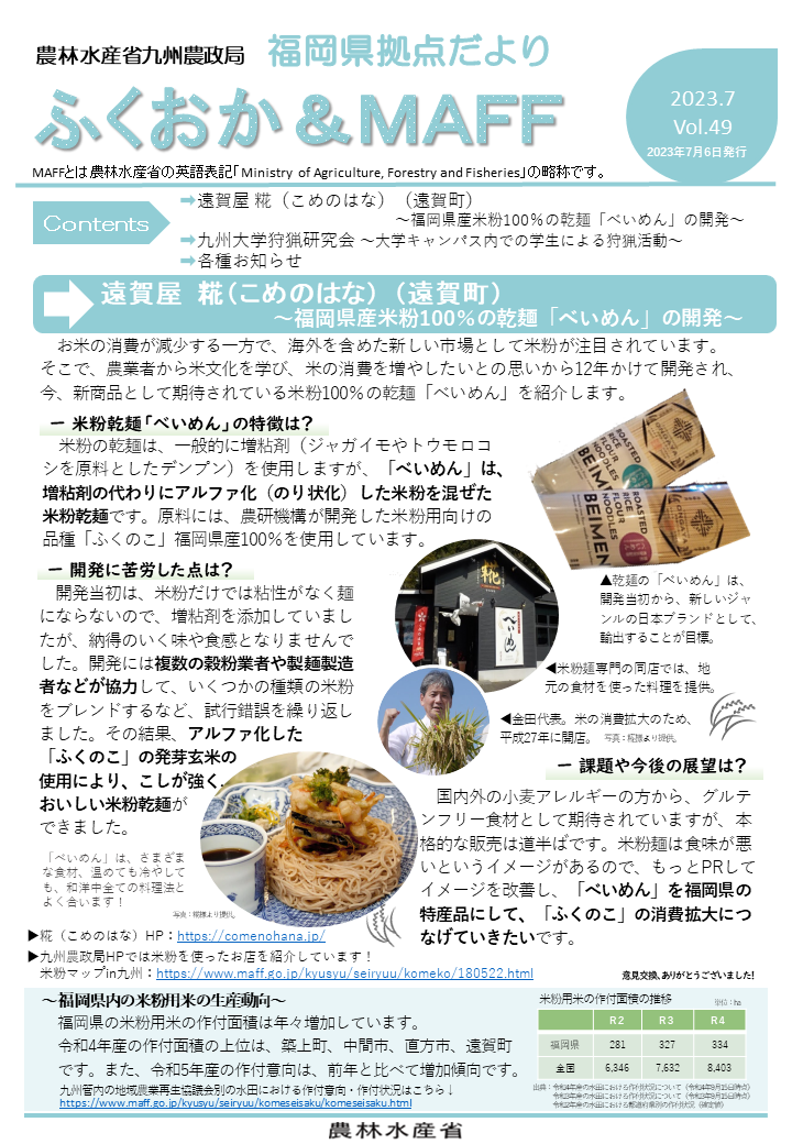 福岡県拠点だよりVOL.49(PDF : 626KB) | →遠賀屋 糀(こめのはな)(遠賀町) ~福岡県産米粉100%の乾麺「べいめん」の開発~ →九州大学狩猟研究会 ~大学キャンパス内での学生による狩猟活動~ →各種お知らせ |