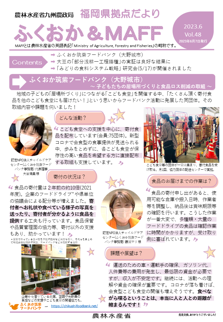 福岡県拠点だよりVOL.48(PDF : 1,660KB) | →ふくおか筑紫フードバンク(大野城市)~ 子どもたちの居場所づくりと食品ロス削減の取組 ~ →大豆の「部分浅耕一工程播種」の実証は良好な結果に~ JA福岡大城みどりの食料システム戦略推進協議会~ →「みどりの食料システム戦略」 研究会 (5月17日)が開催されました |