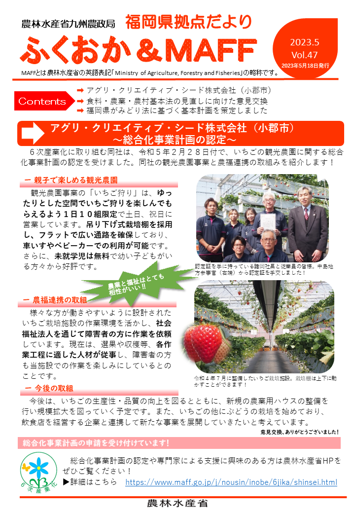 福岡県拠点だよりVOL.47(PDF : 688KB) | →アグリ・クリエイティブ・シード株式会社(小郡市) →食料・農業・農村基本法の見直しに向けた意見交換 →福岡県がみどり法に基づく基本計画を策定しました |
