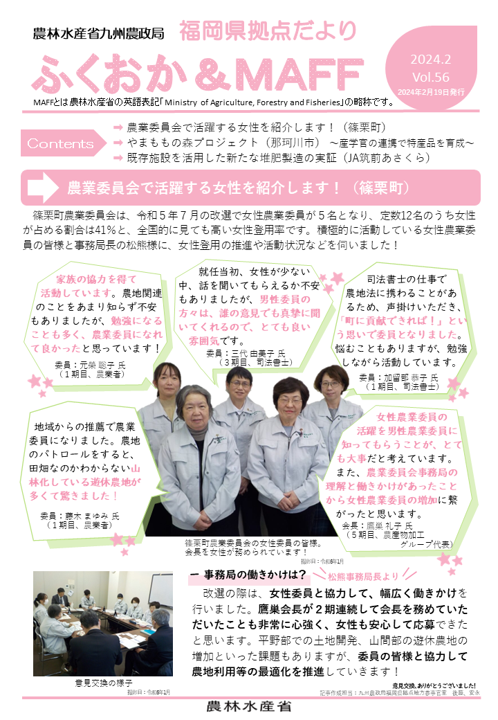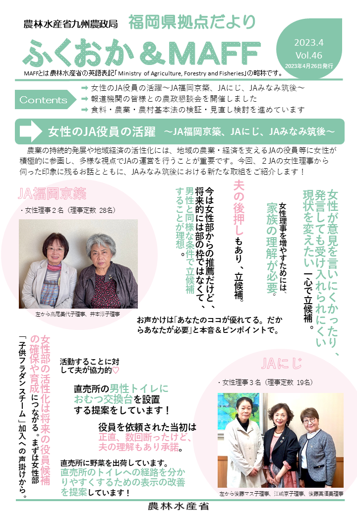 福岡県拠点だよりVOL.46(PDF : 1,539KB) | →女性のJA役員の活躍~JA福岡京築、JAにじ、JAみなみ筑後~ →報道機関の皆様との農政懇談会を開催しました →食料・農業・農村基本法の検証・見直し検討を進めています |