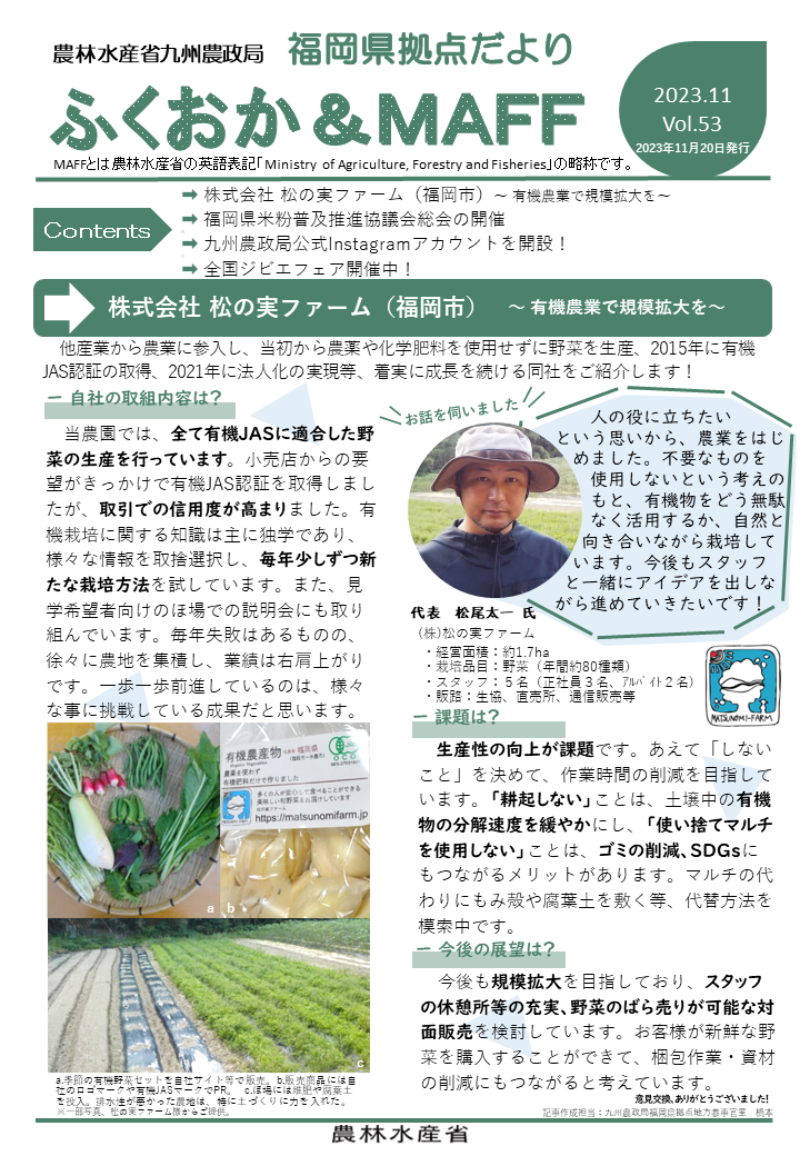 福岡県拠点だよりVOL.53(PDF : 913KB) | →株式会社 松の実ファーム(福岡市)~有機農業で規模拡大を~ →福岡県米粉普及推進協議会総会の開催 →九州農政局公式Instagramアカウントを開設! →全国ジビエフェア開催中! |