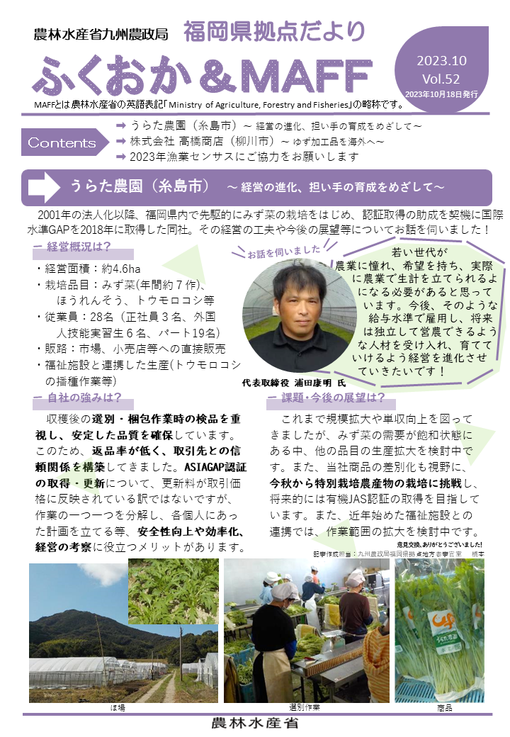 福岡県拠点だよりVOL.52(PDF : 1,164KB) | →うらた農園(糸島市)~ 経営の進化、担い手の育成をめざして~ →株式会社 高橋商店(柳川市)~ ゆず加工品を海外へ~ →2023年漁業センサスにご協力をお願いします |