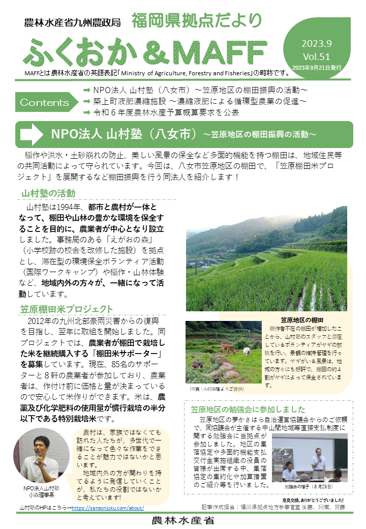 福岡県拠点だよりVOL.51(PDF : 1,254KB) | →NPO法人 山村塾(八女市)~笠原地区の棚田振興の活動~ →築上町液肥濃縮施設 ~濃縮液肥による循環型農業の促進~ →令和6年度農林水産予算概算要求を公表 |
