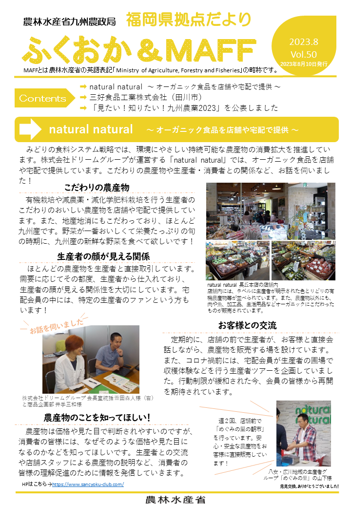 福岡県拠点だよりVOL.50(PDF : 1,110KB) | →natural natural ~オーガニック食品を店舗や宅配で提供~ →三好食品工業株式会社(田川市) ~「ふくよかまる」を使用した豆腐の製造~ →「見たい!知りたい!九州農業2023」を公表しました |