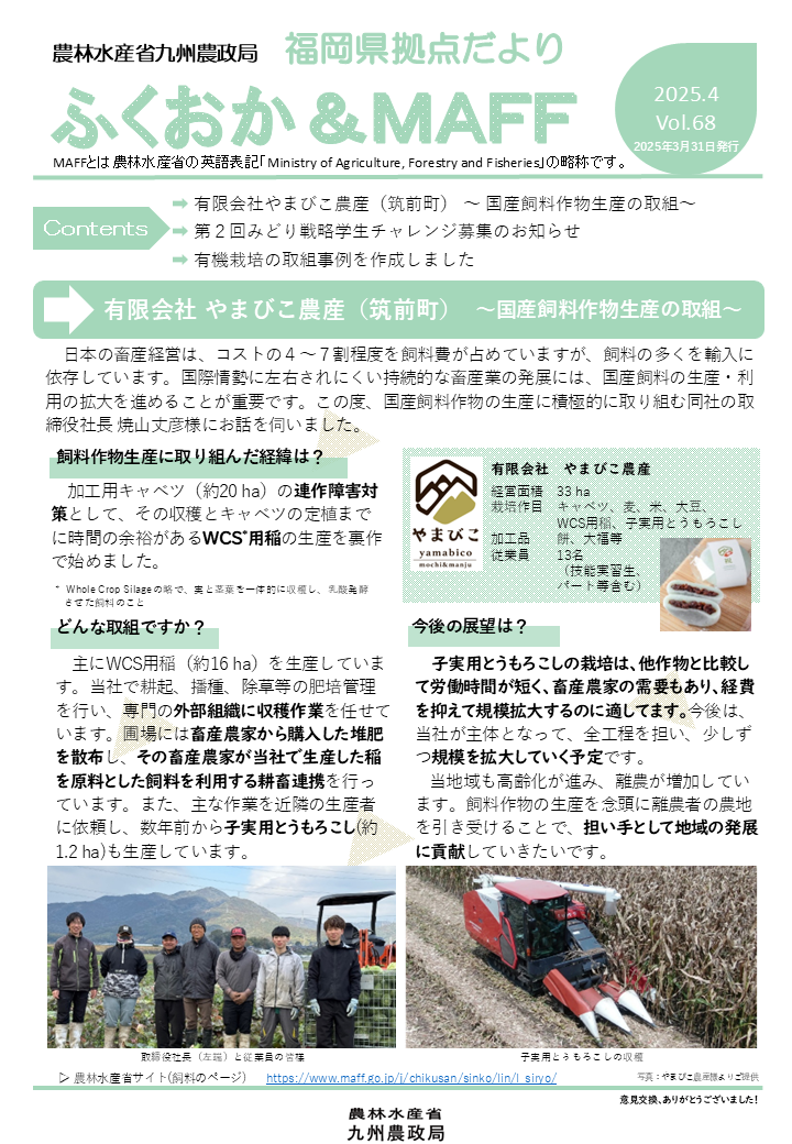 福岡県拠点だよりVOL.68(PDF : 1,260KB) | →有限会社やまびこ農産(筑前町)~国産飼料作物生産の取組~ →第2回みどり戦略学生チャレンジ募集のお知らせ →有機栽培の取組事例を作成しました |