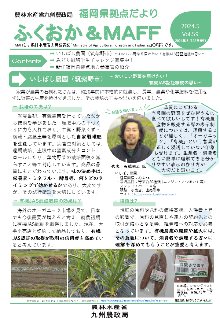 福岡県拠点だよりVOL.59(PDF : 1,202KB) | →いしばし農園(筑紫野市)~おいしい野菜を届けたい!有機JAS認証継続の思い~ →みどり戦略学生チャレンジ募集中! →新任福岡県拠点地方参事官の紹介 |