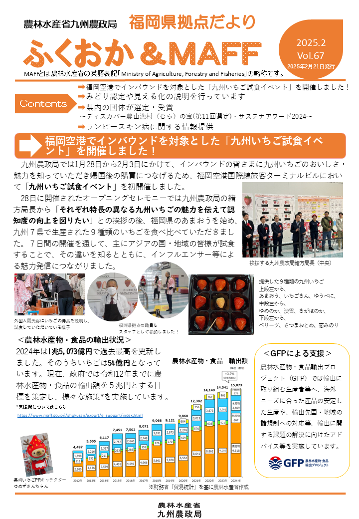 →福岡空港でインバウンドを対象とした「九州いちご試食イベント」を開催しました! →みどり認定や見える化の説明を行っています →県内の団体が選定・受賞 ~ディスカバー農山漁村(むら)の宝(第11回選定)・サステナアワード2024~ →ランピースキン病に関する情報提供 |