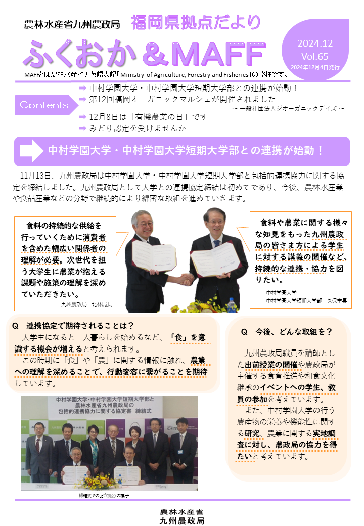 福岡県拠点だより VOL.65(PDF : 1,072KB) | →中村学園大学・中村学園大学短期大学部との連携が始動! →第12回福岡オーガニックマルシェが開催されました ~一般社団法人ジオーガニックデイズ~ →12月8日は「有機農業の日」です →みどり認定を受けませんか |
