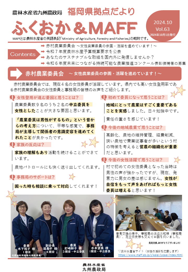 福岡県拠点だよりVOL.63(PDF : 1,163KB) | →赤村農業委員会~女性農業委員の参画・活躍を進めています!~ →令和7年度農林水産予算概算要求を公表 →あなたのサステナブルな取組を国内外に発信しませんか? →令和6年度未来につながる持続可能な農業推進コンクール表彰候補者の募集 |
