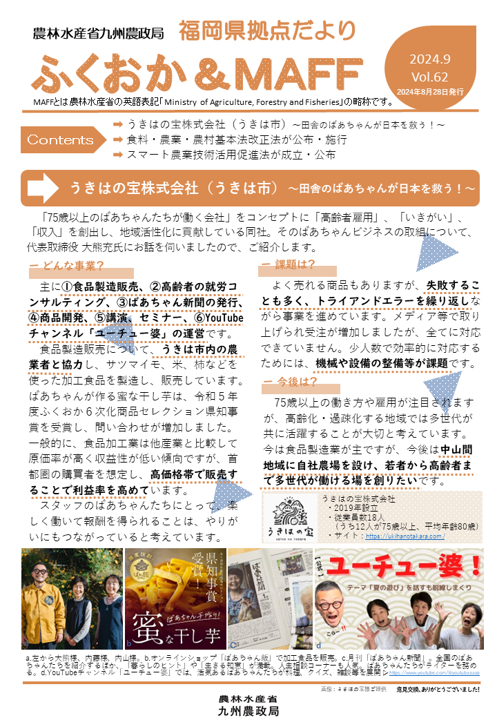福岡県拠点だよりVOL.62(PDF : 1,385KB) | →うきはの宝株式会社(うきは市)~田舎のばあちゃんが日本を救う!~ →食料・農業・農村基本法改正法が公布・施行 →スマート農業技術活用促進法が成立・公布 |