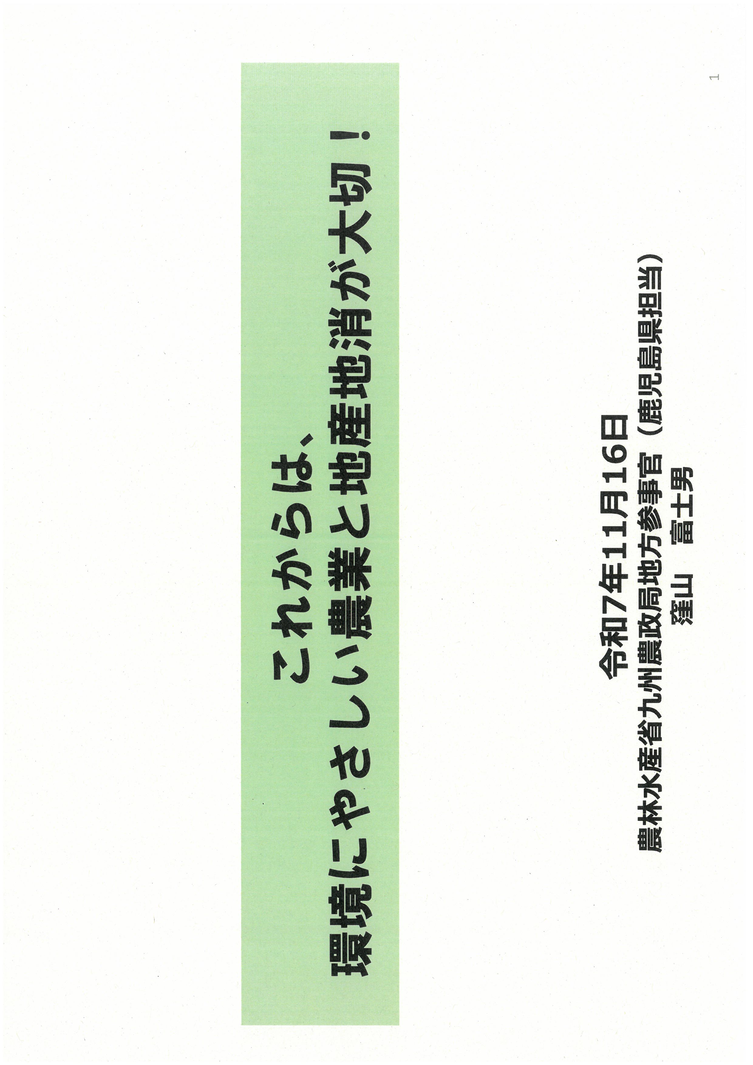 令和7年11月16日(日曜日)に、日置市日置地区公民館で開催された文化講演会において、「これからは、環境にやさしい農業と地産地消が大切!」と題して、最近の米事情、食料・農業・農村基本法の改正、みどりの食料システム戦略の意義や鹿児島県拠点の取組等について説明させていただきました。参加された方からは、米の価格水準に関する質問や、学校給食での米飯給食の拡大などについてのご要望がありました。