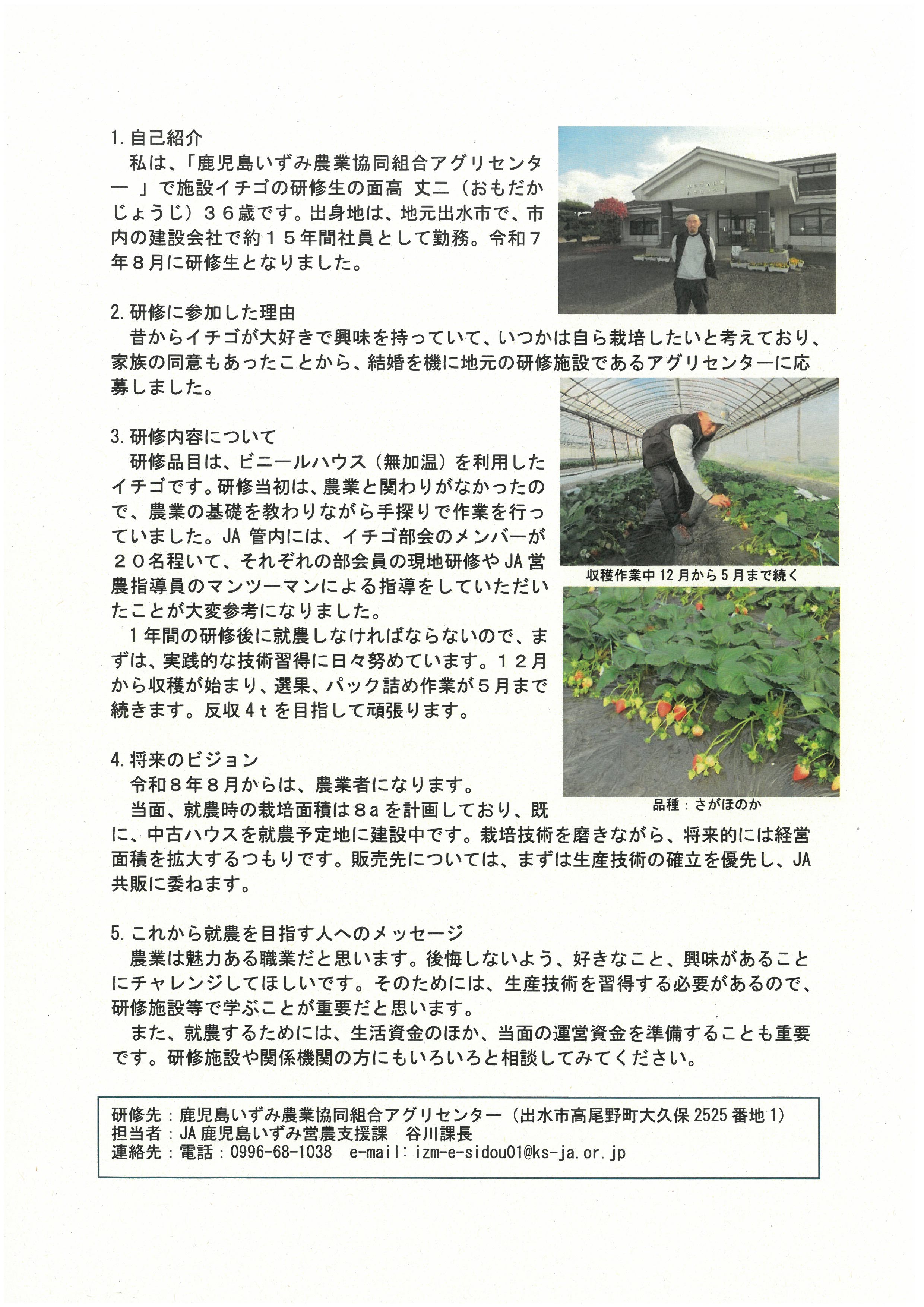 今回は、「鹿児島いずみ農業協同組合アグリセンター」で施設イチゴの栽培研修中の面高丈二さん(36歳)。出身は、地元である出水市。