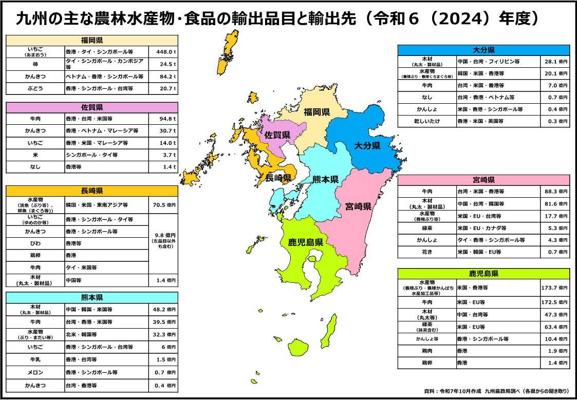 九州の主な農林水産物・食品の輸出品目と輸出先マップ