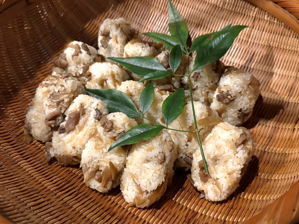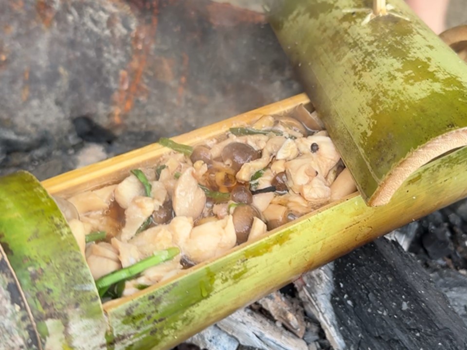 また高千穂の郷土料理「かっぽ鶏」は、鶏肉やしめじ、ニラなどの食材を竹の器に入れ火にかけて調理します。