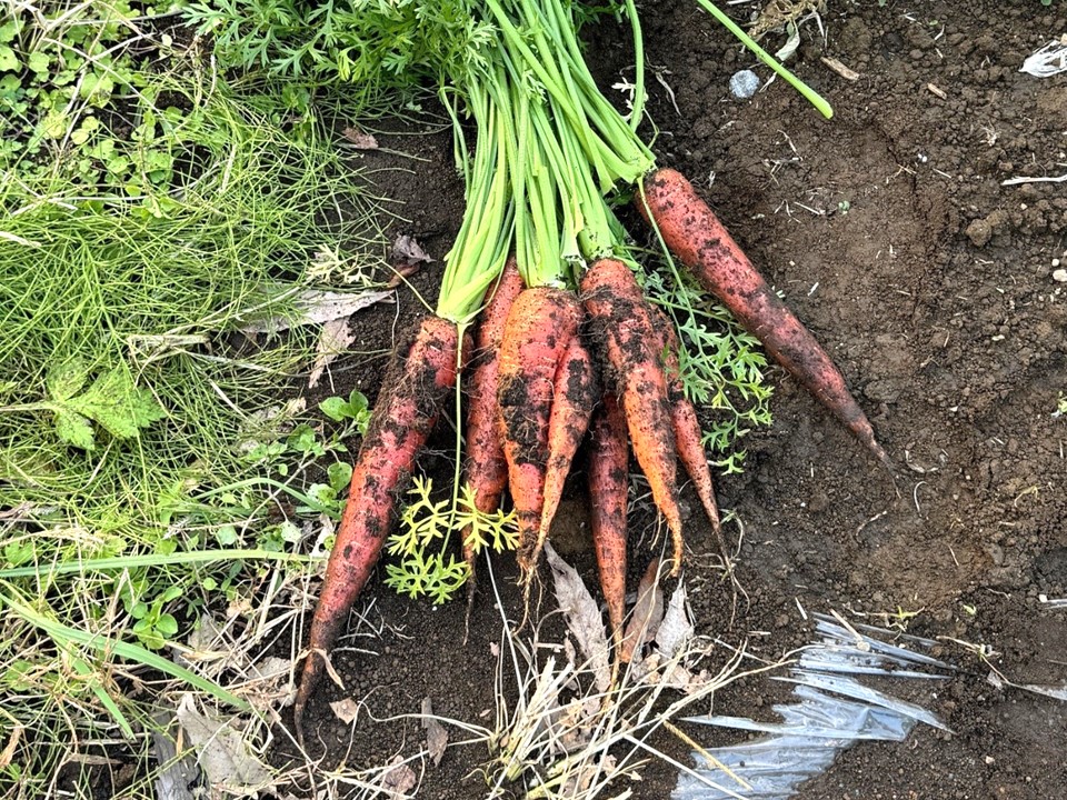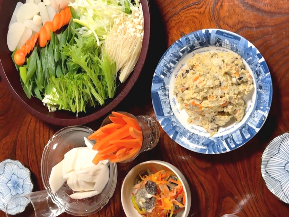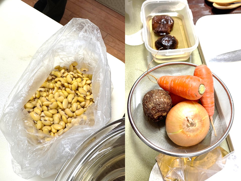 畑で収穫体験した人参や幻の大豆と呼ばれるみさを大豆を使った郷土料理「おしよせ」。