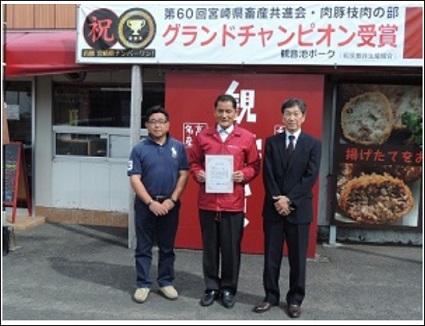 九州農政局は、六次産業化・地産地消法に基づき申請された総合化事業計画の認定を平成30年7月31日付けで行いました。今回は、九州で宮崎県から申請のあった2件(九州累計410件、宮崎累計100件)が認定されました。宮崎県拠点は8月16日に、今回、自社ブランド「まるみ豚」を使用した熟成肉の開発・販売で認定された「有限会社共同ファーム」(宮崎県川南町)において、認定証を代表取締役日髙義暢様に手交しました。