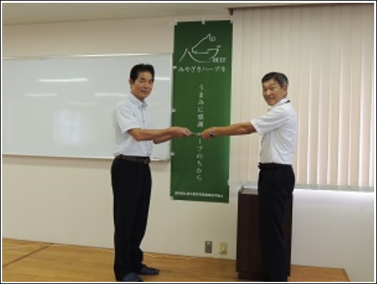 九州農政局は、六次産業化・地産地消法に基づき申請された総合化事業計画の認定を平成30年8月31日付けで行いました。今回は、九州で宮崎県から申請のあった1件(九州累計412件、宮崎累計101件)が認定されました。宮崎県拠点は9月14日に、今回、組合員が生産したハーブ牛の精肉販売事業で認定された「宮崎県乳用牛肥育事業農業協同組合」(宮崎県宮崎市)において代表理事組合長藤原辰男様に手交しました。
