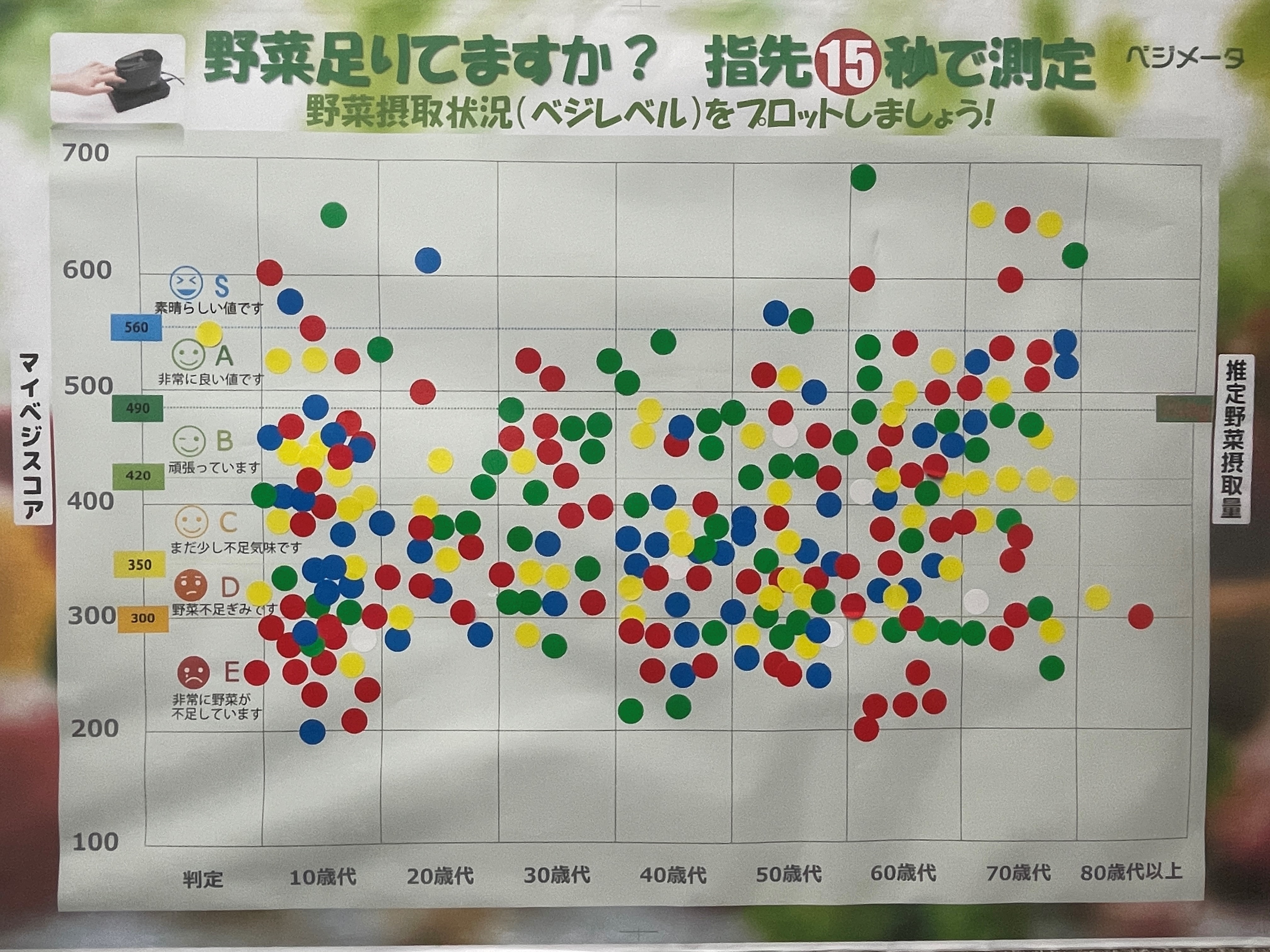 野菜摂取量測定会では、A判定(推定野菜摂取量350g以上)の方は19%であり、81%の方が野菜不足であるとの結果が出ました。参加者からは「思ったとおり足りてないな」「毎日野菜を食べるように気をつけている」等の感想をいただきました。
