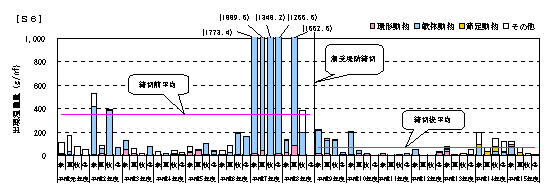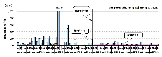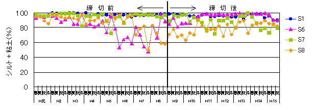 1.湾奥南側S6,S8では、締切前に底質の泥分の減少がみられるものの、湾口部B4,S10,B5では、潮受堤防締切り前後での変化傾向は見られていません。