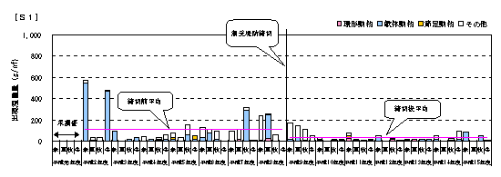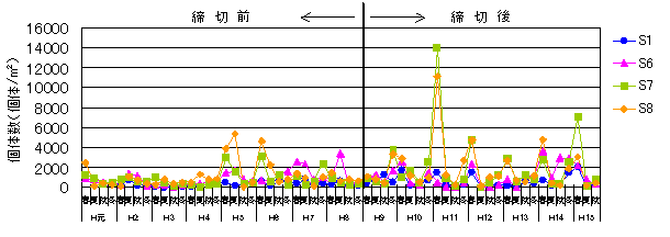 2.S7,S8,B5では、締切後に個体数が増加しています。また、その他の地点では、締切りによる変化は認められません。 |
