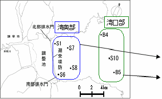 1.湾奥南側S6,S8では、締切前に底質の泥分の減少がみられるものの、湾口部B4,S10,B5では、潮受堤防締切り前後での変化傾向は見られていません。