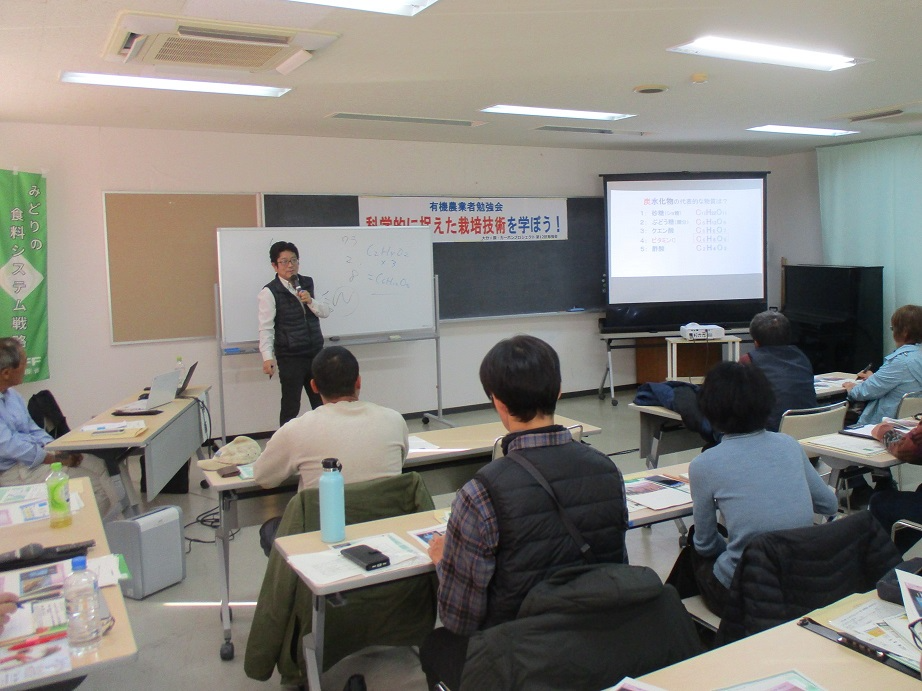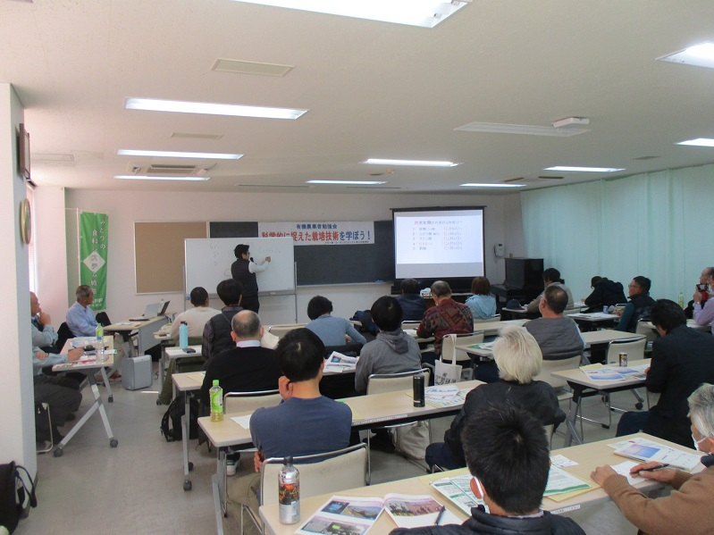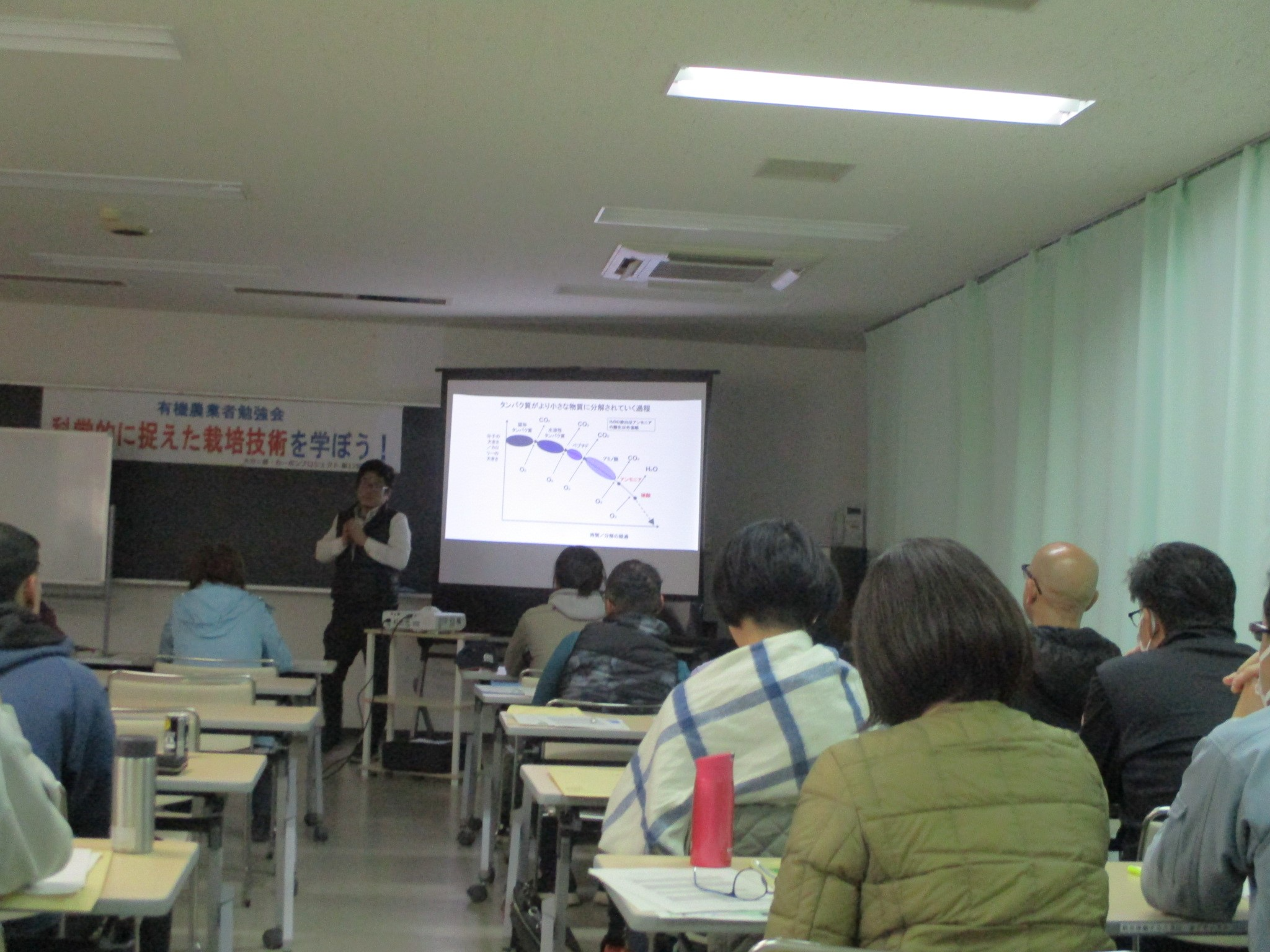 配布資料にもとづく内容を皮切りに、パワーポイントやホワイトボードを使用し栽培技術や植物原理等々について講演が行われました。その後、講演内容を含めて栽培技術に関する質疑応答が行われました。