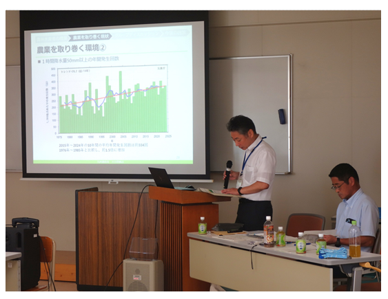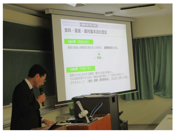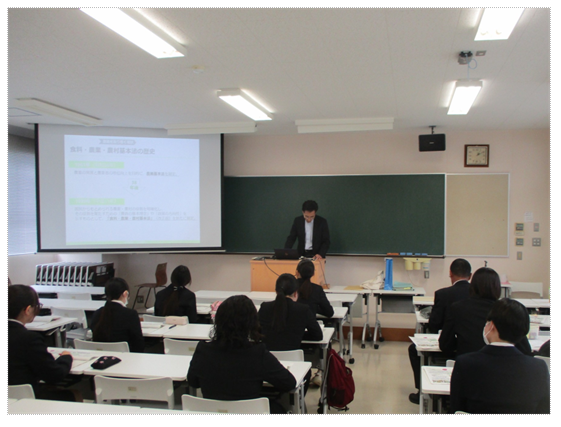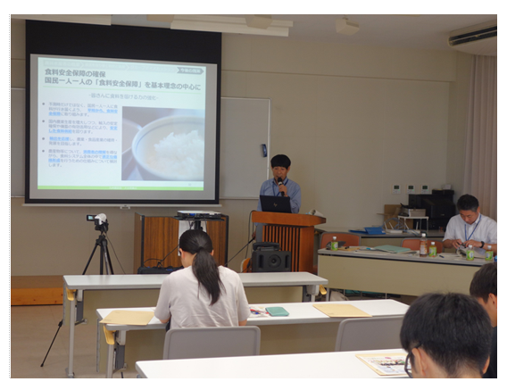 九州農政局大分県拠点では、大学生や農業高校等の生徒等を対象に、持続可能な「食」と「環境」について考えるきっかけを作り、農林水産行政への理解醸成を図ることを目的として、新たな「食料・農業・農村基本計画」や「みどりの食料システム戦略」等の農業施策の出前授業を行っています。