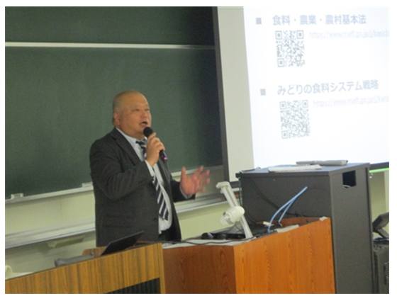5月16日、サステイナビリティ観光学部の1年生180名を対象に出前授業を行いました。新たな「食料・農業・農村基本計画」、「みどりの食料システム戦略」に関する説明の後、「現状について思ったこと」「どうしたら改善するか」をテーマにグループディスカッションを行いました。