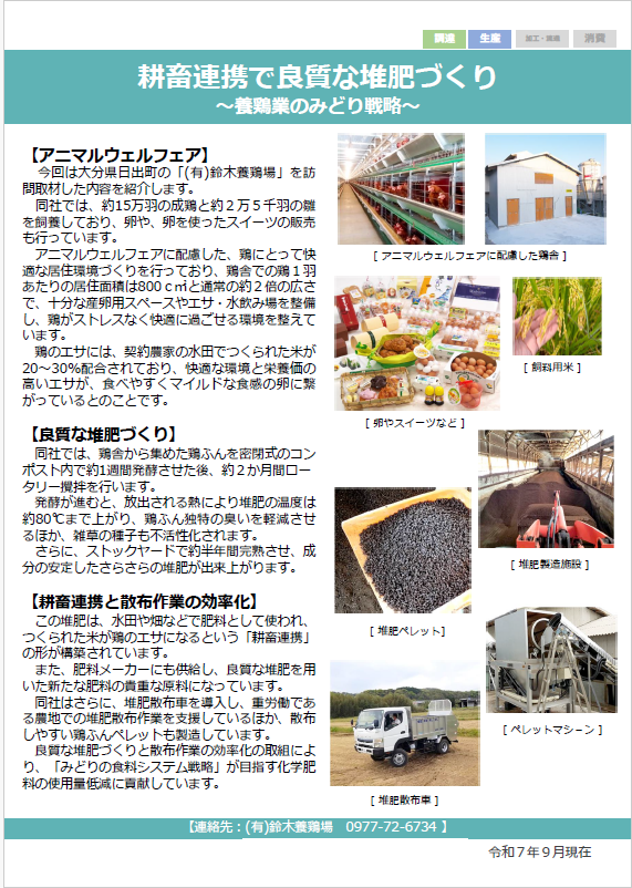 | 大分の在来作物とみどり戦略(充実した土づくりで伝え継ぐ)(PDF : 837KB) | 耕畜連携で良質な堆肥づくり ~養鶏業のみどり戦略~(PDF : 341KB) |
