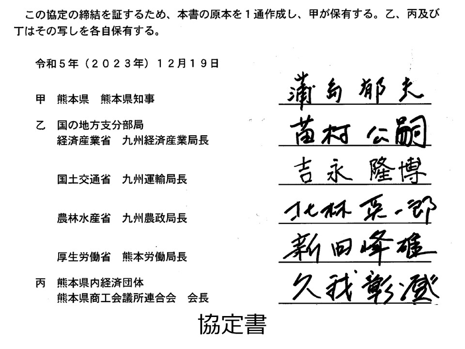 令和5年12月19日(火曜日)に、熊本県庁にて「価格転嫁の円滑化に関する協定」を締結しました。協定は、県内で価格転嫁に係る機運を醸成し、サプライチェーン全体での共存共栄、付加価値の向上を図り、県内中小企業及び小規模事業者の稼げる力を高めることを目的としたものです。当日は協定の主体となる熊本県と関係機関、団体の代表が参加し、締結書に署名しました。