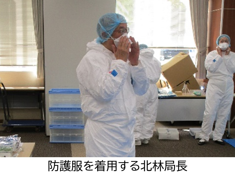 九州農政局では、高病原性鳥インフルエンザ等の特定家畜伝染病が発生した場合、発生県から防疫作業の支援要請が行われた際には職員の派遣を行い、発生農場での迅速な防疫措置に協力しています。このため、防疫作業の重要性を認識し、防疫措置が円滑にできるよう、防疫作業に関わる可能性のある職員を対象とした「農場等防疫作業支援者向け防疫作業講習会」を対面とウェブにて開催しました。講習会では、北林九州農政局長にも防護服の着脱を体験していただきました。