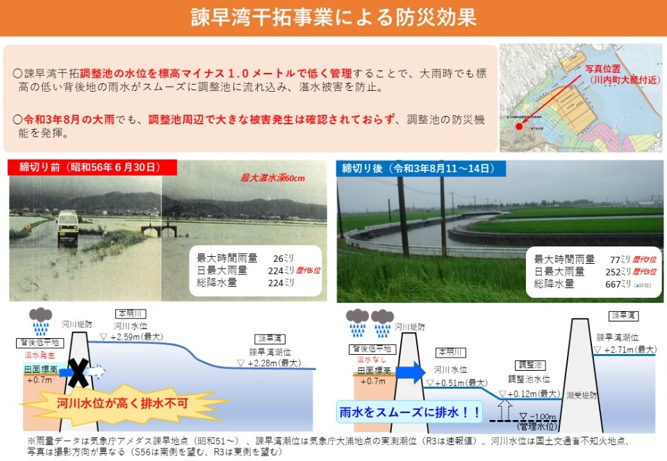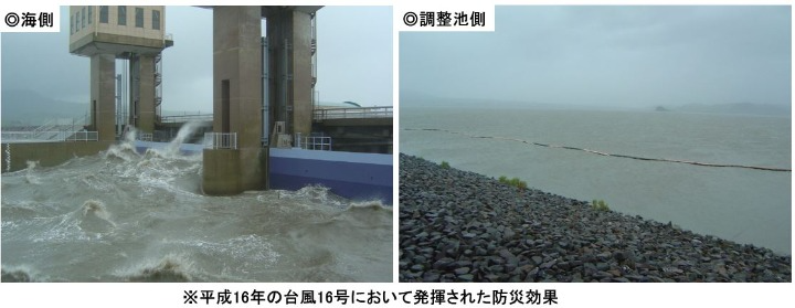 全長約7kmの潮受堤防を建設し調整池を設け、調整池の水位を低く管理することにより周辺低平地の排水性が改善するとともに、高潮や洪水に対する防災機能を強化します。 |