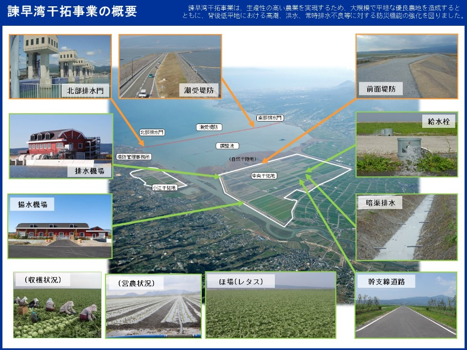 対象地域、面積 対象地域:長崎県諫早市、長崎県雲仙市 造成面積:約870ha (うち、農地等面積672ha) 調整池面積:約2,600ha |