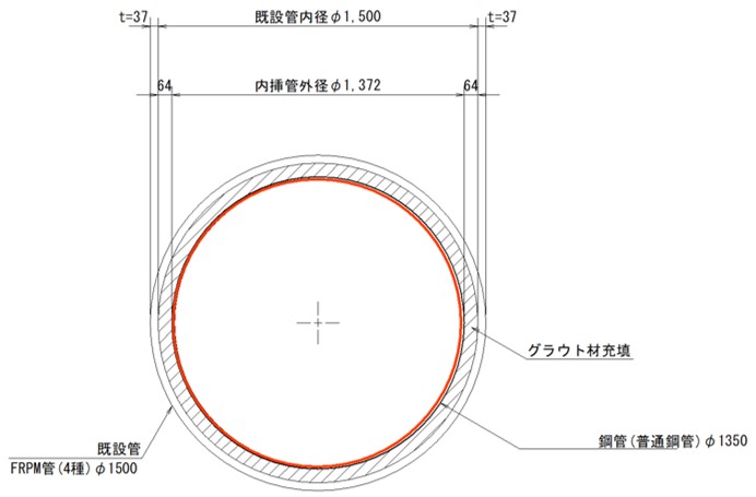 既設管(FRPM管)の内部に鋼管を設置し、既設管と鋼管との間隙部に高強度の裏込材を注入し、管の構造機能のを回復させる。