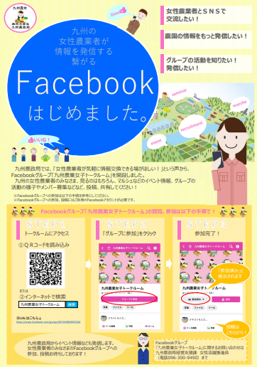 九州農政局は、「女性農業者が気軽に情報交換できる場がほしい!」という声から、Facebookグループ「九州農業女子トークルーム」を開設しました。「九州農業女子トークルーム」へはこちらからどうぞ↓(Facebookにジャンプします)