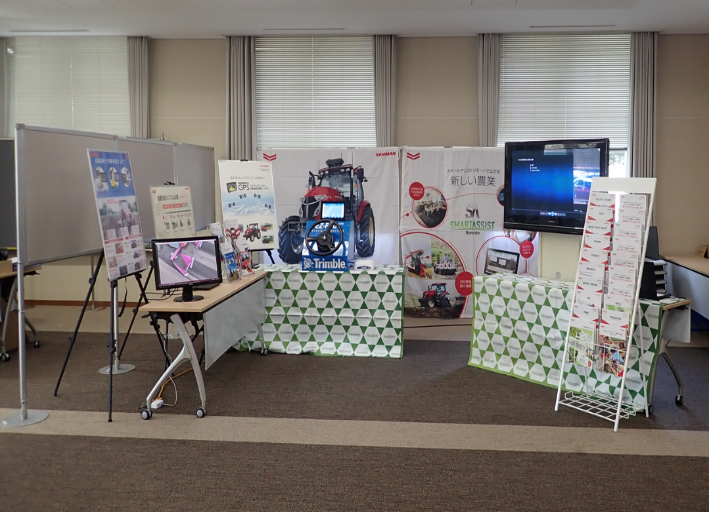 閉会後は、会場の後方において、株式会社アグリスマート及びヤンマーアグリジャパン株式会社の協力の下、自動操舵シミュレーター、収穫機動画及び冠水装置などスマート農業関連ブースを設置し、名刺交換会を開催しました。