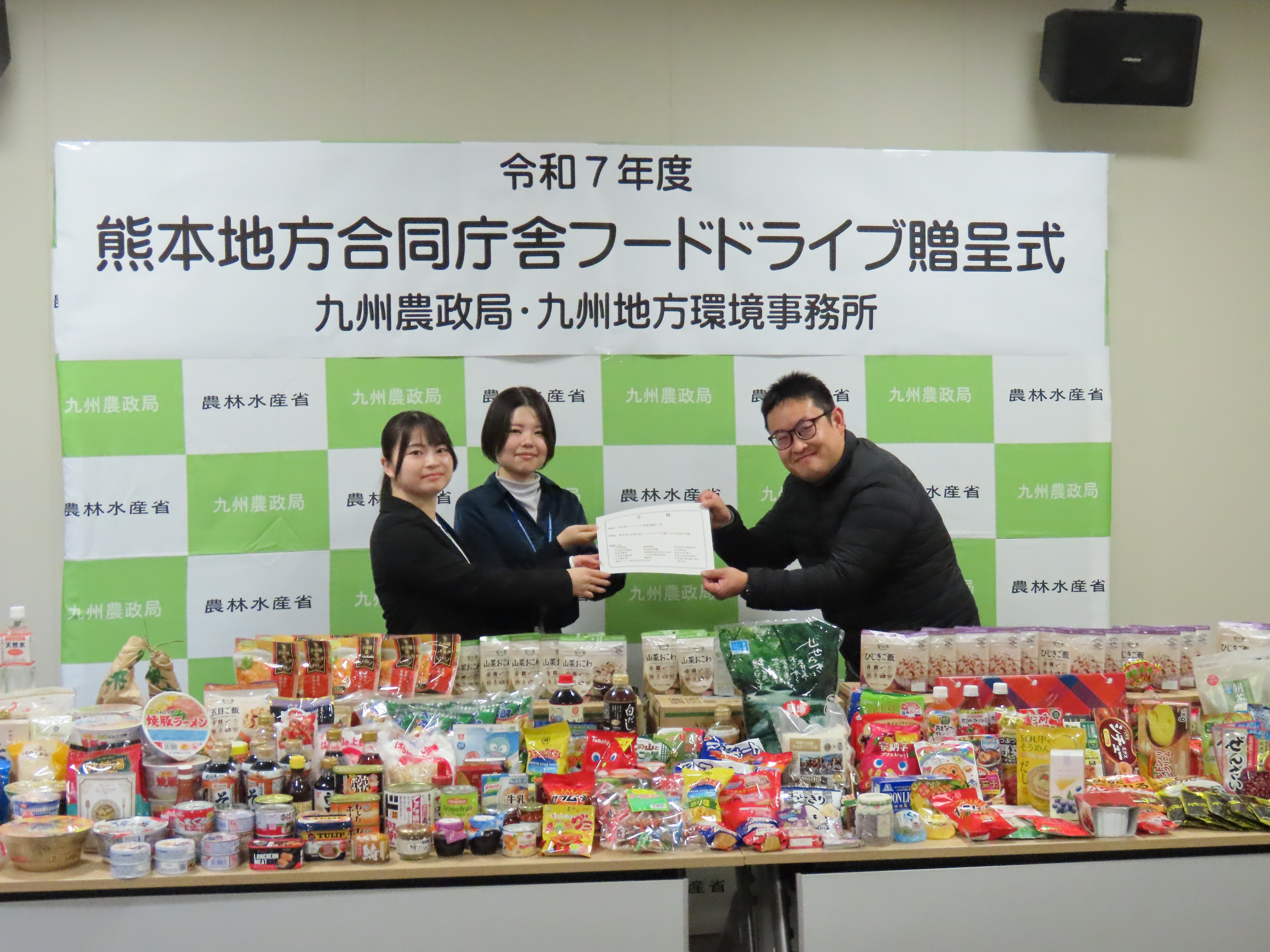 集められた食品は、翌日の12月23日火曜日に九州地方環境事務所職員と九州農政局職員から熊本県フードバンク推進協議会の茶木谷氏へ贈呈されました。