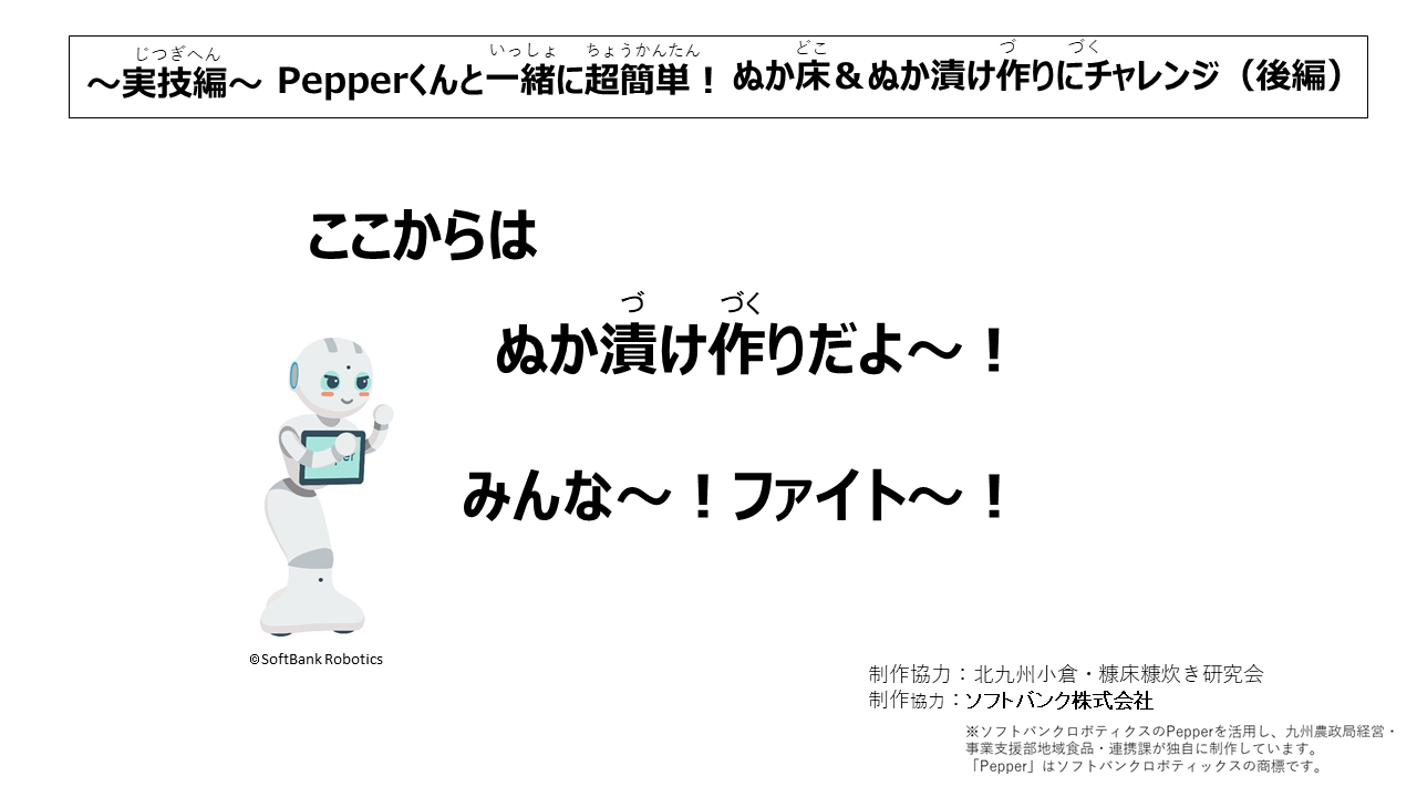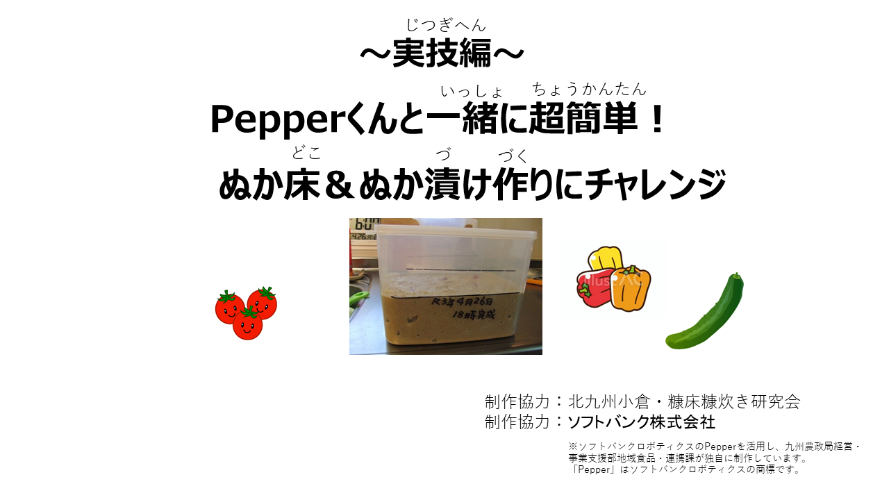 北九州小倉・糠床糠炊き研究会の木村康子先生に教わりながら、超簡単!な「ぬか床&ぬか漬け作り」にチャレンジしてみよう!という企画です。Pepperくんも出演しますよ!