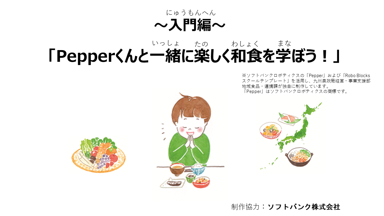 このテンプレートは、和食の良さを感じるきっかけとなる授業制作を目的に作られ、九州農政局は、スライドと台本の制作協力を行いました。( 「和食の日の取組~Pepperと一緒に日本の伝統食『和食』を学ぶ~」)