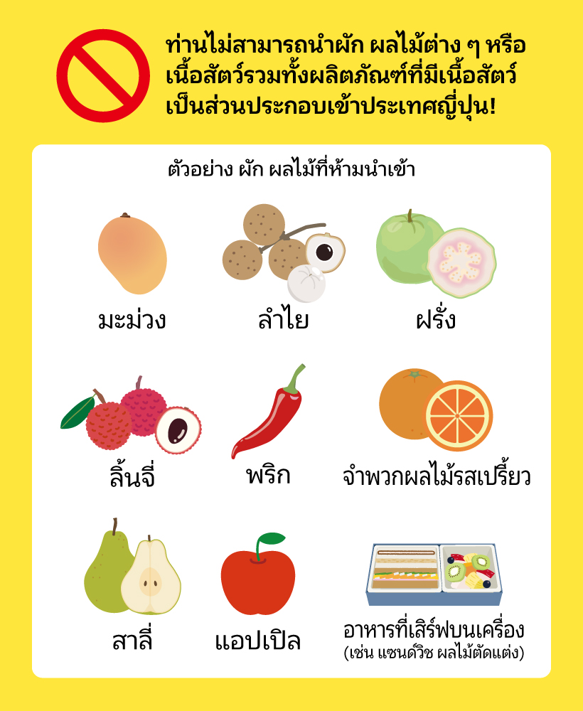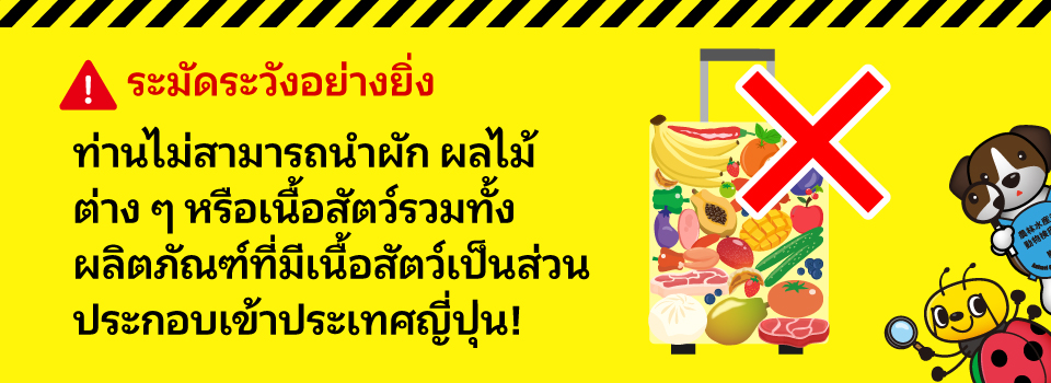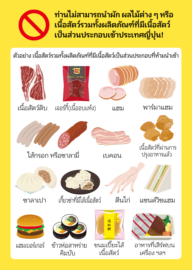 เราใคร่ขอให้ท่านช่วยประชาสัมพันธ์แก่บุคคลรอบข้าง เช่น ครอบครัวหรือเพื่อนของท่านว่า ไม่สามารถนำผัก ผลไม้ หรือเนื้อสัตว์รวมทั้งผลิตภัณฑ์ที่มีเนื้อสัตว์เป็นส่วนประกอบเข้ามาในประเทศญี่ปุ่นได้ รวมถึงห้ามส่งสิ่งของเหล่านี้จากต่างประเทศมาทางไปรษณีย์ให้แก่ผู้ที่พำนักอาศัยอยู่ในประเทศญี่ปุ่นอย่างเด็ดขาด