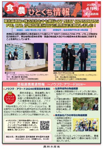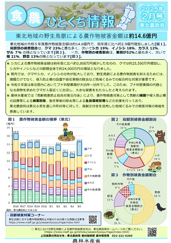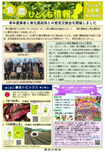 東北農政局では、その時期の食料、農林水産業、農山漁村に関係するさまざまな情報について、わかりやすく提供するため、「食・農ひとくち情報」を毎月作成しています。 |