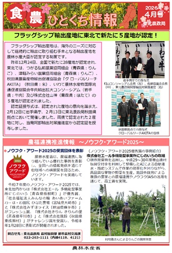 東北農政局では、その時期の食料、農林水産業、農山漁村に関係するさまざまな情報について、わかりやすく提供するため、「食・農ひとくち情報」を毎月作成しています。 |