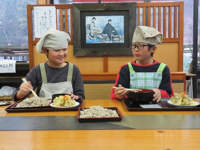 そば打ちを終えた児童たちからは「思ったよりもこねるのに力がいる」「麺を均等に切るのが難しい」といった声が聞かれ、普段何気なく食べているそばが、修練された技術とたくさんの工程を経て調理されていたことに感心している様子でした。
