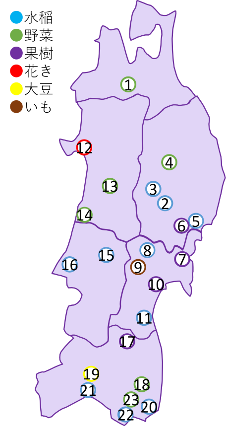 | 山形県 | 3 | 鶴岡市 | おうとう(雨よけ) かき(露地) |